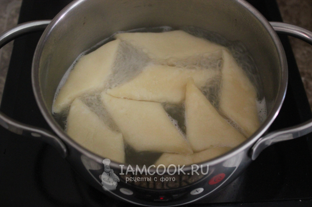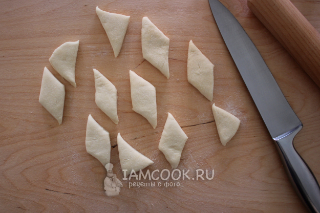 Всё тесто или его порцию раскатайте в плоскую заготовку толщиной 7-10 мм, сильно не давите. Есть варианты толщиной побольше и выглядят почти как булки. Пробовала варить заготовки толщиной 1,5-2 см, тут есть риск недоварить или переварить... В зависимости от размеров получается около 18 заготовок. Разрежьте на треугольные или четырёхугольные куски. Дайте им полежать минут пять, а затем варите.