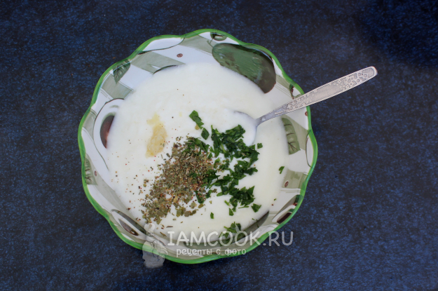 Для соуса нужно жидкую сметану (или мацони) перемешать с измельченными чесноком и зеленью. Соль и перцы – по вкусу.