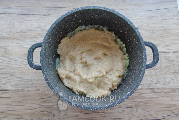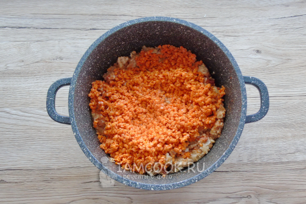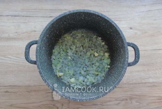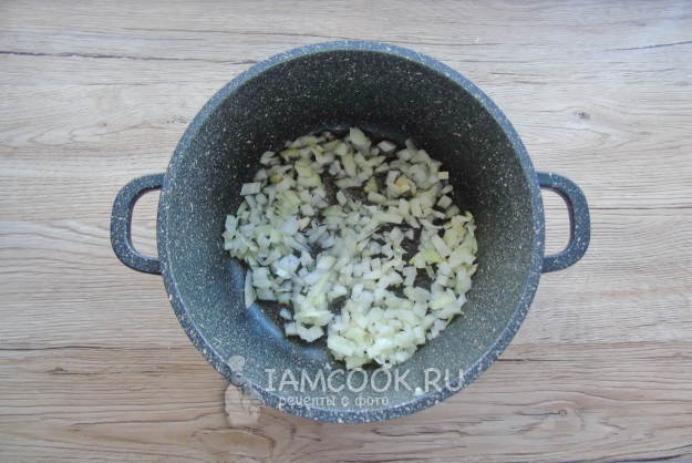 Репчатый лук очистите, помойте и мелко нарежьте. Выложите в кастрюлю с толстым дном или в небольшой казан.