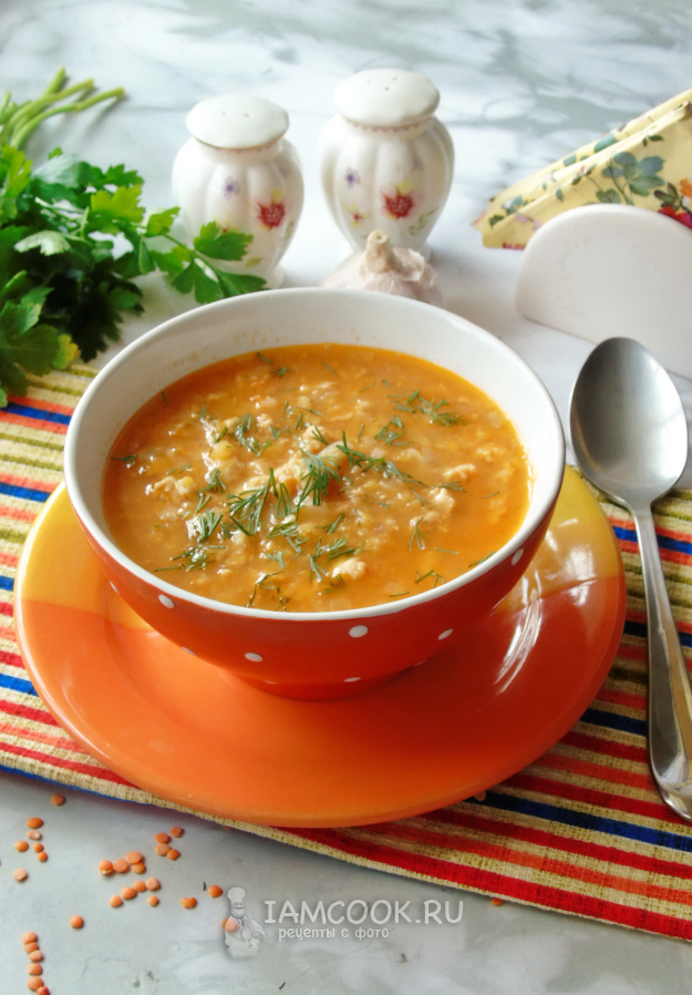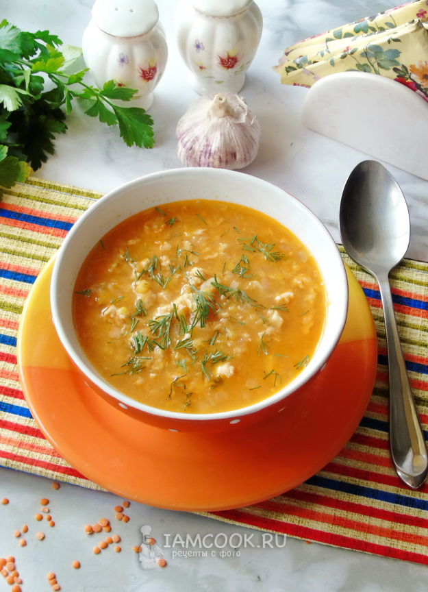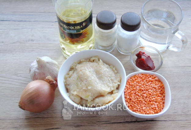 Соберите ингредиенты для приготовления супа с чечевицей и фаршем.