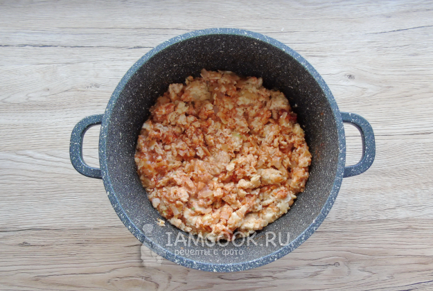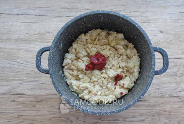 Перемешайте фарш с луком и томатной пастой, тушите 3-4 минуты.