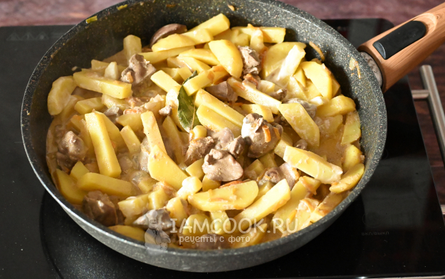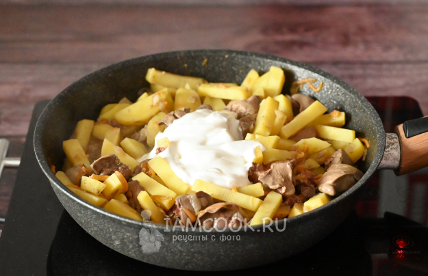 Перемешайте куриную печень и картошку со сметаной, дайте сметане прогреться около 1 минуты, и можно снимать сковороду с плиты - всё готово!