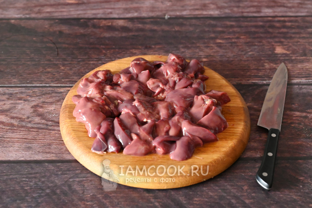 Куриную печень сполосните в холодной воде и нарежьте на небольшие кусочки.