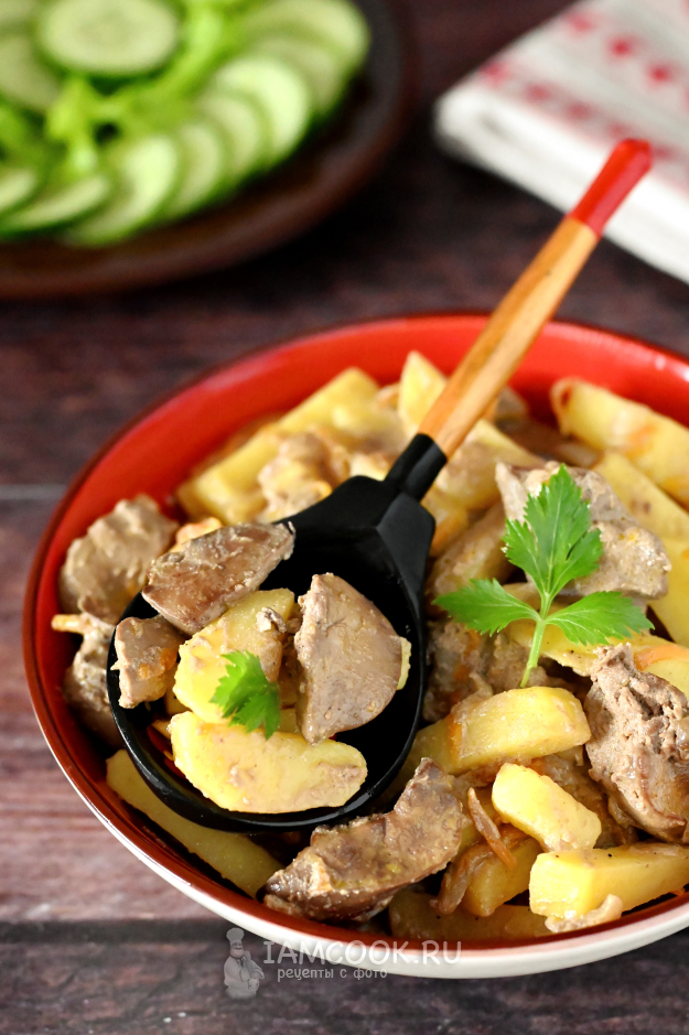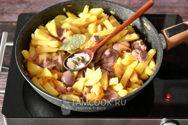 Перемешайте, чтобы соль равномерно распределилась. Влейте немного воды (буквально 2-3 столовых ложки), чтобы ничего не подгорело. Вновь убавьте огонь до минимума и под крышкой доведите печень и картошку до полной готовности. У меня на это ушло 15 минут, а вы следите самостоятельно. Картошка должна стать мягкой, а кусочки куриной печени - полностью приготовиться внутри.