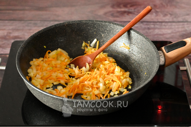Разогрейте сковороду с маслом и обжарьте на среднем огне лук с морковью до прозрачности и лёгкого золотистого цвета (примерно 7-8 минут).