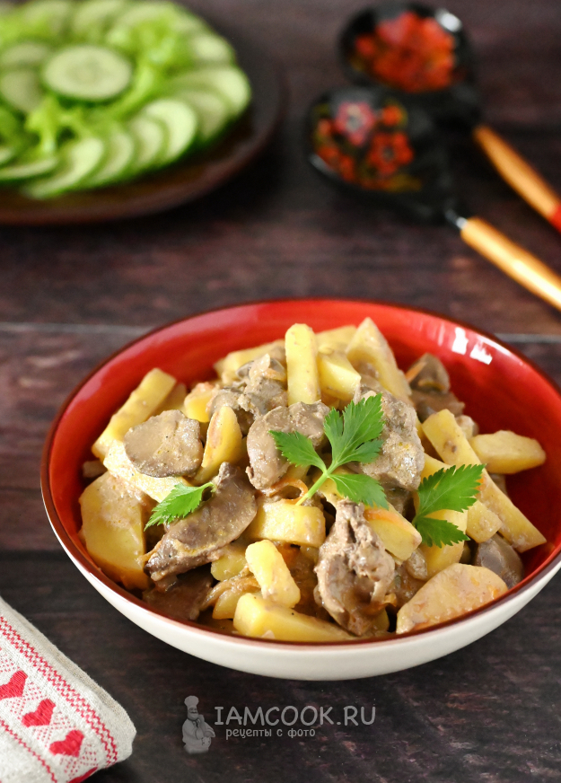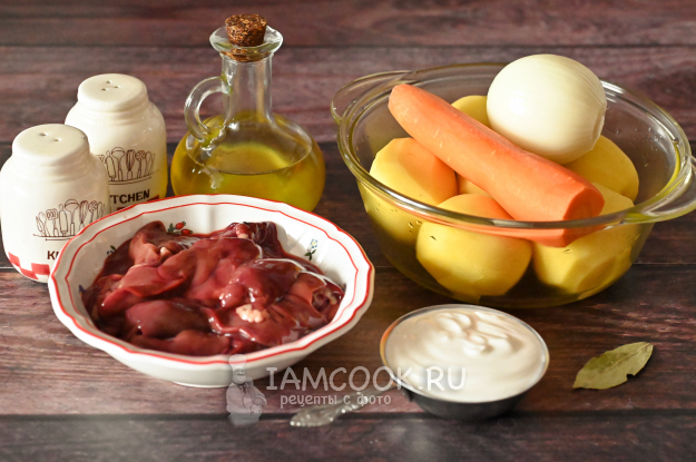 Соберите необходимые продукты для приготовления куриной печени в сметане с картошкой.