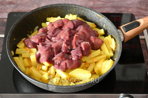 Отправьте печенку в сковороду к картошке и чуть прибавьте огонь. Готовьте, помешивая, несколько минут, чтобы кусочки печени потеряли красный цвет и стали коричневыми.
