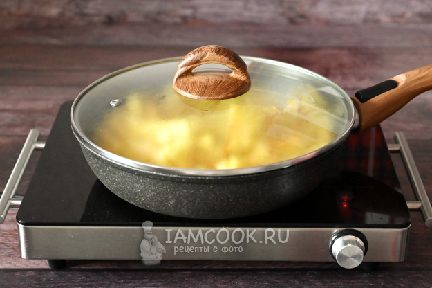 Накройте крышкой, чуть убавьте огонь и доведите картошку до полуготовности, примерно 15-20 минут. Периодически открывайте сковороду и перемешивайте, чтобы картошка готовилась равномерно.