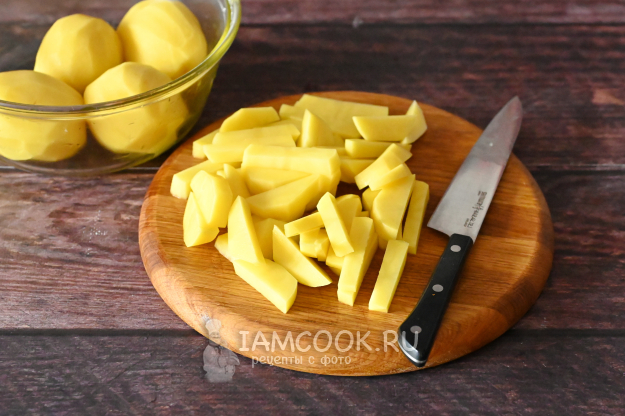 Пока лук с морковкой обжариваются, нарежьте небольшими брусочками картошку.