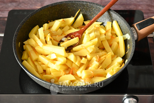 Отправьте картошку в сковороду и перемешайте её с луком и морковью.