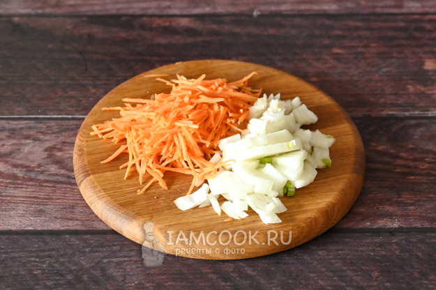 Нарежьте кубиком лук, а морковь натрите на тёрке (или нарежьте тонкой соломкой).