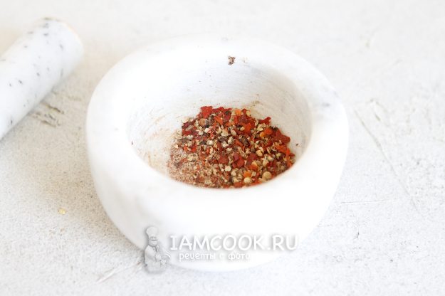 Набор специй можно собрать любой. Я взяла кориандр, черный перец горошком, хлопья чили сухие и соль. Специи разотрите в ступке.