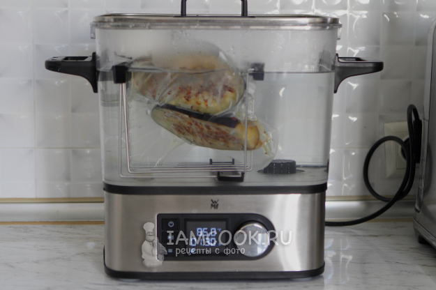 Нагрейте воду до температуры 85 градусов. Когда вода нагреется до нужной температуры, опустите пакет в воду и готовьте 90 минут.