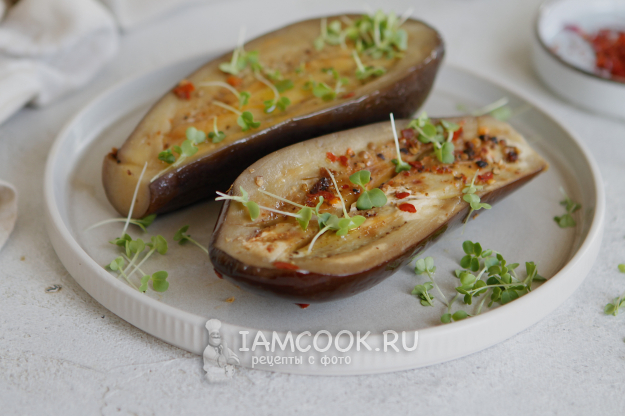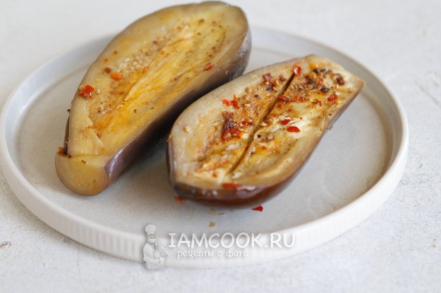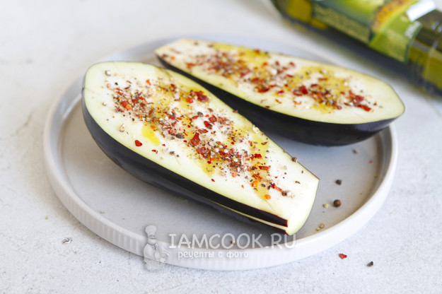 Сбрызните оливковым маслом. Вотрите специи с маслом в мякоть баклажана.