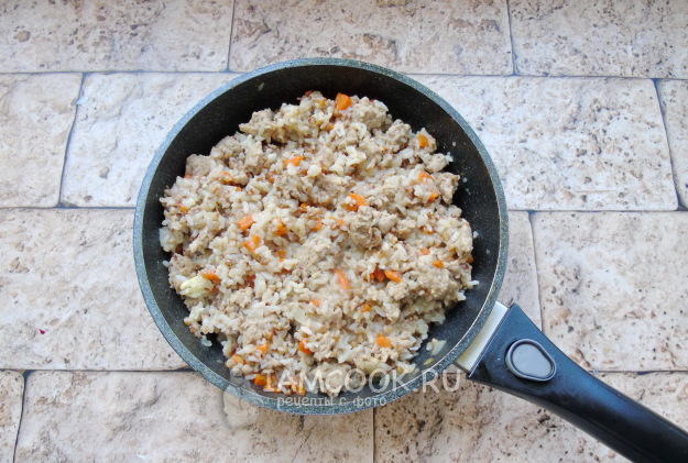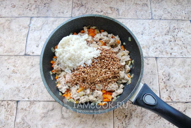 Рис и гречку промойте, выложите в сковороду с овощами и фаршем. Еще немного посолите.