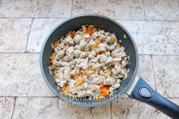 Жарьте фарш с овощами, перемешивая и разбивая комочки лопаткой, до изменения цвета.