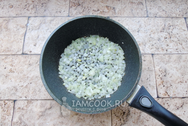 Репчатый лук очистите, помойте и мелко нарежьте. Выложите в сковороду с растительным маслом. Жарьте лук до прозрачности.