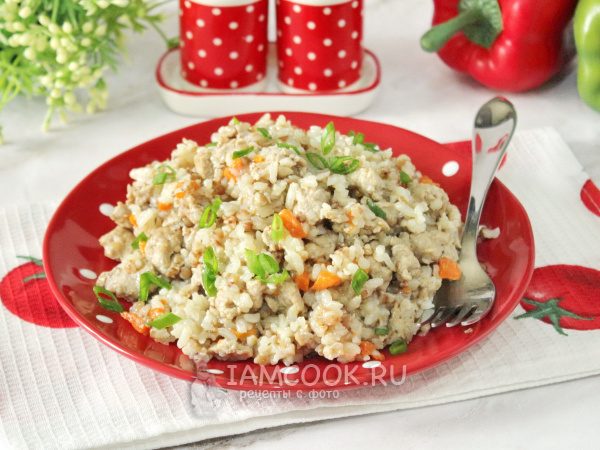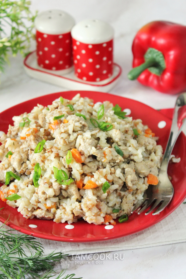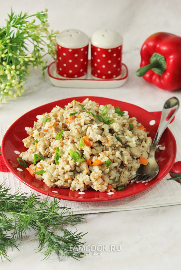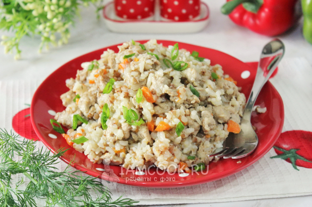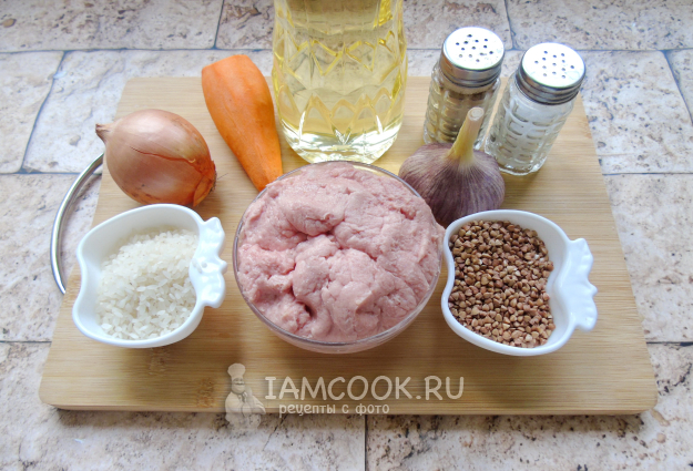 Соберите ингредиенты для приготовления гречки с рисом и фаршем.