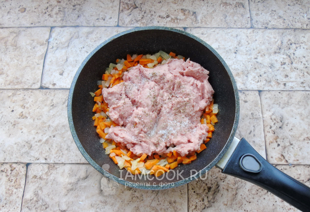 После выложите в сковороду мясной фарш. Посолите, поперчите, добавьте сухие приправы. У меня орегано.