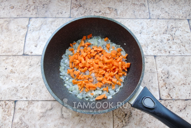 Морковь очистите, помойте и нарежьте мелкими кубиками. Добавьте в сковороду с луком. Продолжайте жарить еще 4-5 минут.