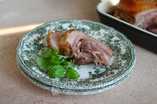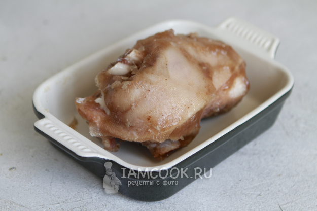 На следующий день достала пакет из холодильника, вскрыла его, рульку переложила в форму для запекания. Застывшее желе с рульки собрала и тоже переложила в форму для запекания. Рульку смазала кусочком сливочного масла (30 г) и отправила в духовку.