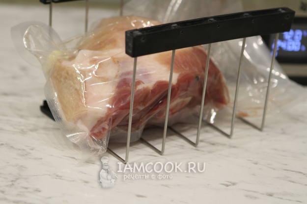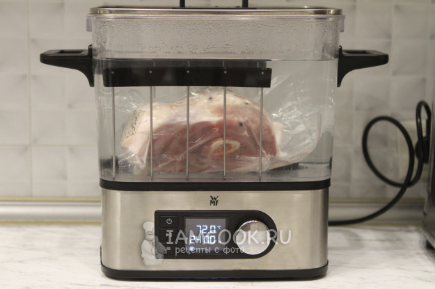 Контейнер заполнила водой. Выставила температуру 72 градуса. Когда вода нагрелась до нужной температуры, прибор сообщил об этом. Далее я уже поместила пакет с рулькой в воду, закрыла крышкой и готовила 24 часа. Важно: пакет должен быть полностью погружен в воду.