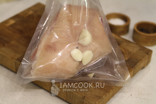 Свиную рульку переложила в пакет для вакуумации. В пакет также положила дольки чеснока и перец горошком.