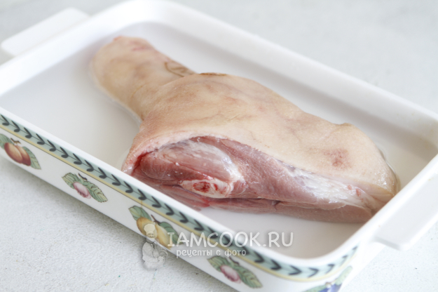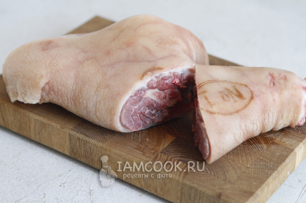Придя домой, свиную рульку замочила в прохладной воде на 10 часов. За это время воду меняла 5 раз. Места штампа пришлось зачистить ножом.