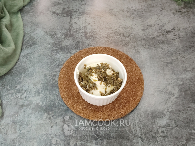 Пока подсушивается хлеб, приготовим "крем". Мелко нарубите каперсы, смешайте их с творожным сыром, добавьте 1 ч. л. оливкового масла, все тщательно перемешайте.