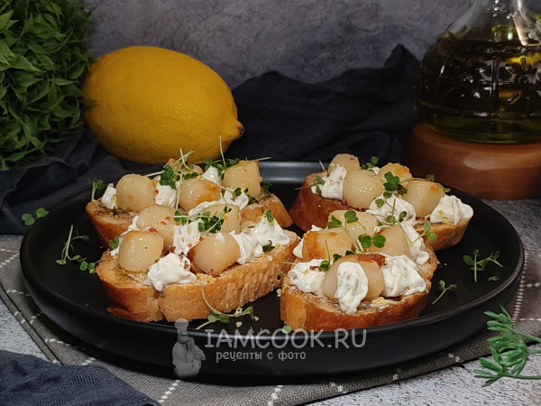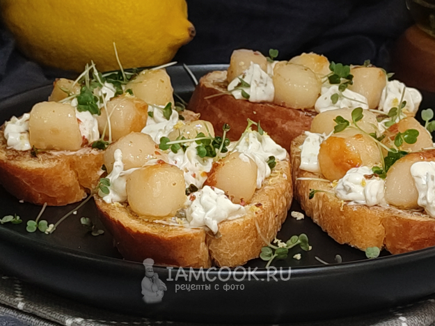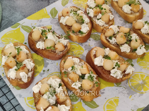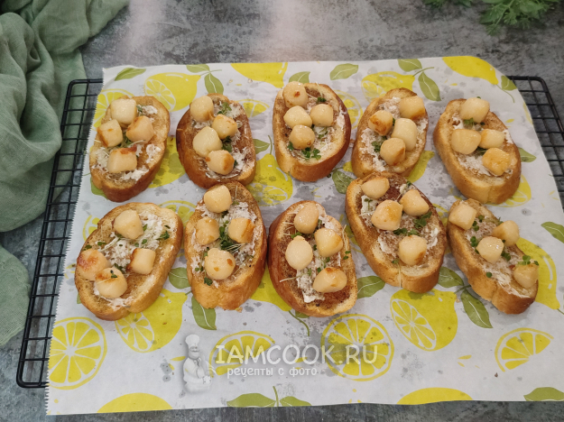 Брускетты с гребешком готовы! При подаче можно украсить брускетты цедрой лимона, молотым розовым перцем, слегка полить тем маслом, которое осталось после жарки гребешков.
