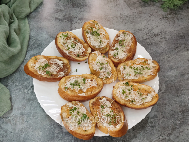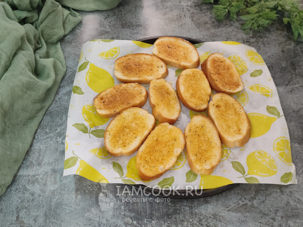 Нарежьте хлеб (у меня обычный батон) на ломтики. В небольшой мисочке смешайте 2-3 ст. л. оливкового масла и соль. У меня соль с томатами и базиликом. Если такой у вас нет, смешайте оливковое масло, соль по вкусу и сушеные травы (базилик, орегано, смесь прованских), тоже получится вкусно. Этой ароматной смесью смажьте ломтики хлеба, отправьте в разогретую до 180 градусов духовку, запекайте до румяности, минут 5-7, но ориентируйтесь на особенности своей духовки - возможно, ваша справится быстрее.
