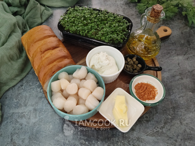 Соберите ингредиенты для приготовления брускетты с гребешком. Гребешки заранее разморозьте в холодильнике. Творожный сыр подойдет простой, без добавок, или с зеленью, его выньте из холодильника минут за 30 до начала готовки, чтобы он стал мягким и пластичным. Я сегодня использую микрозелень (рукола), также подойдет обычная петрушка или базилик, например.