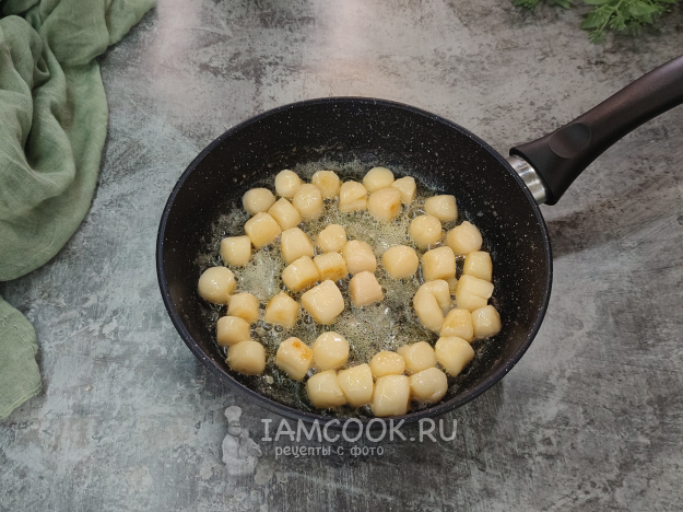 В сковороде разогрейте 1 ст. л. оливкого масла, добавьте к нему сливочное, обжарьте гребешки. Гребешки продаются в глазури, поэтому даже после правильной разморозки при термообработке все равно будет какое-то количество жидкости - ее выпариваем на сильном огне, чуть подрумяним гребешки, слегка присолим, и гребешки готовы.