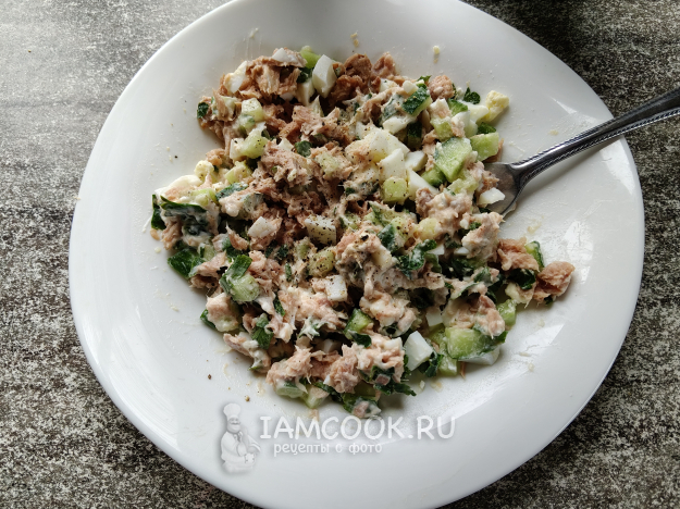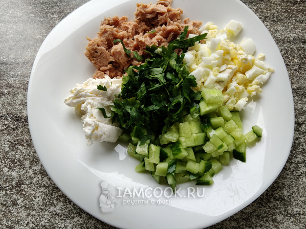 Тунца размять вилкой (без жидкости), огурец и яйцо нарезать кубиками, нарубить зелень.