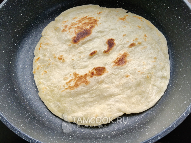 Лепешку роти достать из морозилки, положить на горячую сковороду, испечь до готовности и румяного состояния с обеих сторон.