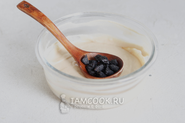 Изюм промойте, обсушите. У меня изюм был крупный, поэтому я нарезала его на кусочки. Изюм добавьте в тесто.