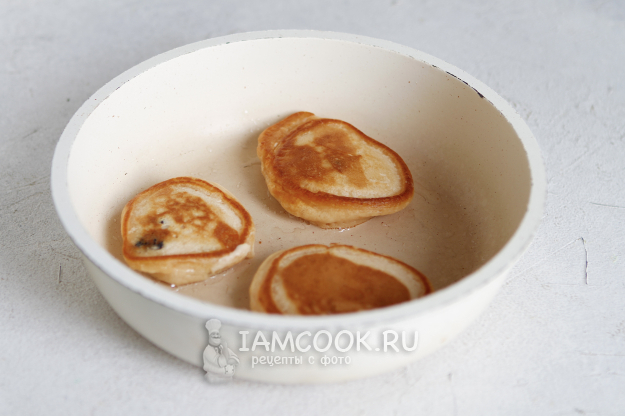Жарьте оладушки с двух сторон на небольшом огне до румяного цвета.