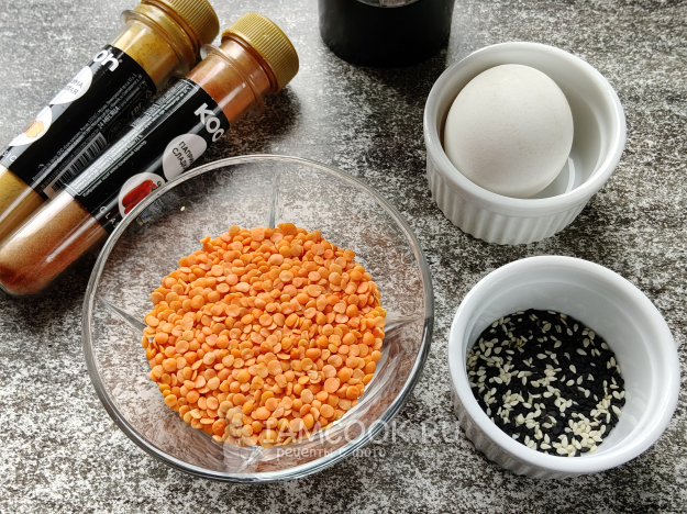 Печенье из красной чечевицы готовить будем из таких ингредиентов. Специи можно взять любые любимые.