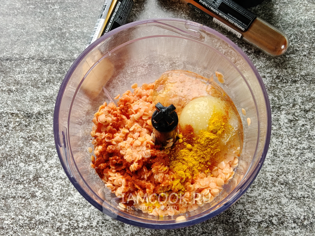 Переложить чечевицу в чашу блендера, добавить яйцо, соль и специи.