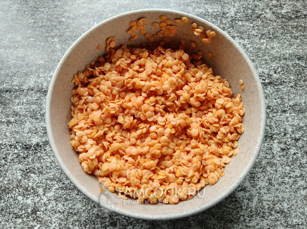 Чечевицу залить водой и оставить на пару часов (у меня она впитала всю влагу и разбухла уже через час).