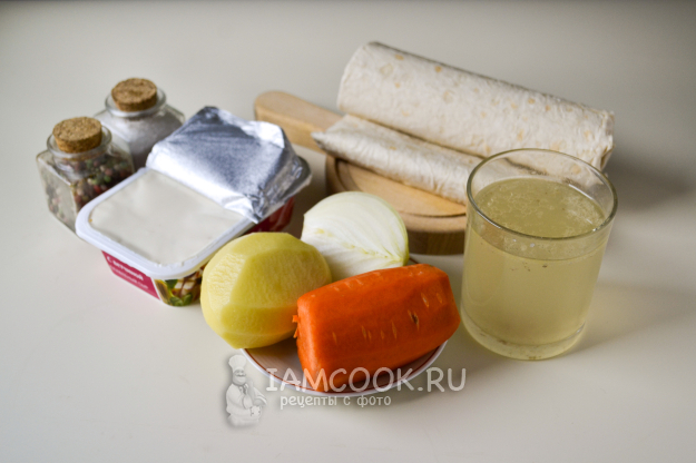 Соберите продукты для приготовления супа с лавашом. Картошку, морковь, лук почистите, вымойте. Для супа сварите мясной бульон. Выньте мясо из бульона и отделите от костей.