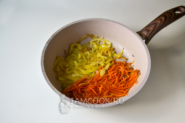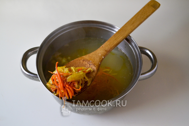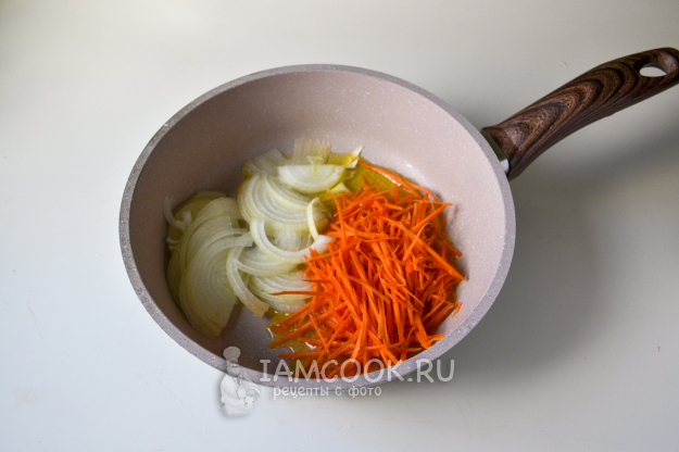 Пока картофель варится в бульоне, натрите на терке морковь, нарежьте лук. Положите овощи на разогретую с растительным маслом сковороду.