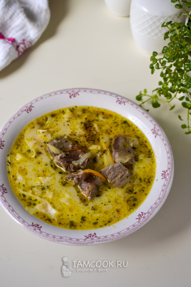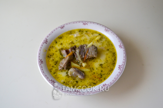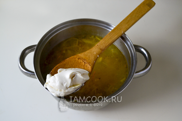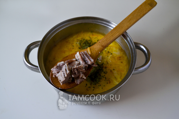 Положите плавленый сыр. Доведите бульон до кипения, сделайте огонь тихим и варите до полного расплавления сыра.