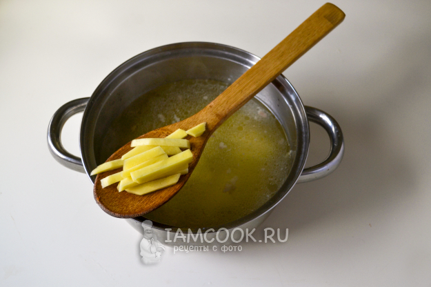 В кипящий говяжий бульон положите нарезанную соломкой картошку.