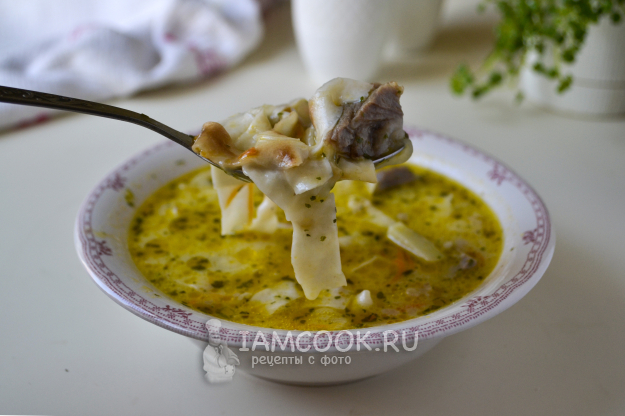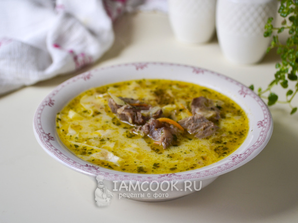 Положите в кастрюлю нарезанное мясо (от бульона, по вкусу), сушеную зелень. Дайте супу настояться пару минут.