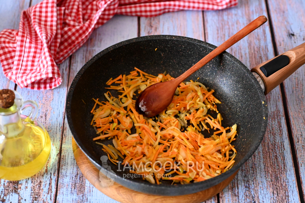 Начнём с обжаривания лука и моркови. Нарежьте лук и морковь тонкой соломкой и слегка обжарьте на разогретом растительном масле. Огонь средний, по времени - около 5-7 минут.