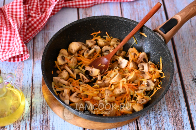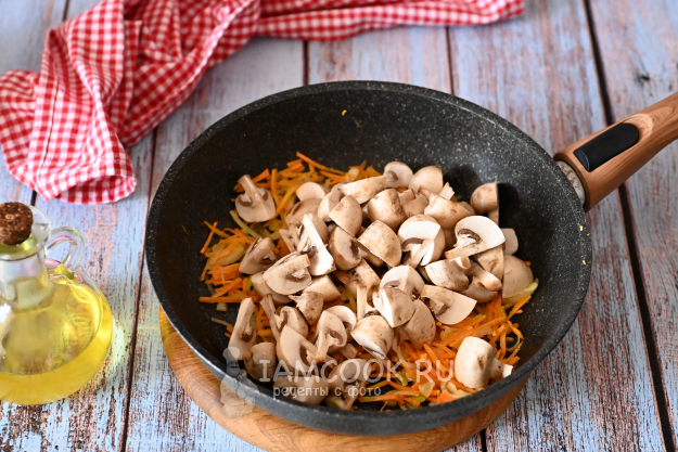 Шампиньоны ополосните, нарежьте на четвертинки и отправьте в сковороду к луку и моркови.