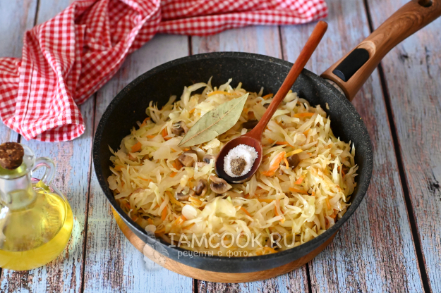 Перемешайте капусту с солью, чтобы она равномерно распределилась, и убавьте огонь до среднего или чуть ниже. Тушите капусту с грибами под крышкой до готовности. По времени у меня ушло 35 минут, а вы исходите из сорта капусты, который у вас будет. Молодая капуста приготовится за 10-15 минут, а зимним сортам капусты порой нужно около 1 часа.