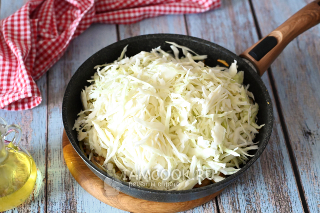 Нашинкуйте соломкой капусту и выложите её в сковороду.