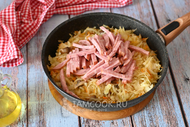 В конце приготовления добавьте к капусте нарезанную крупной соломкой колбасу и перемешайте.